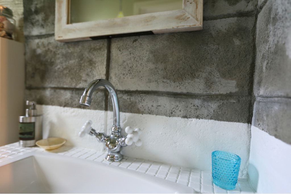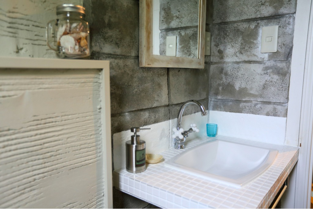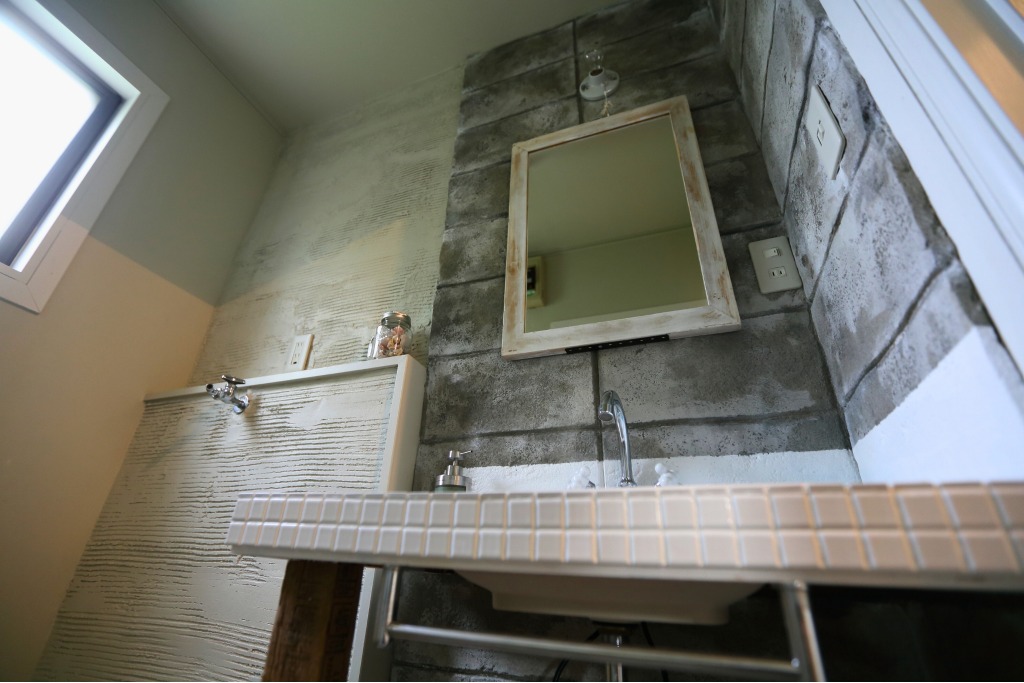 タイル天板×造作カウンターで空間に統一感。既存の洗面台は撤去し、白タイル×造作カウンターで新たに設計。直線的でシャープなデザインが、荒々しい壁の質感と絶妙にマッチしています。