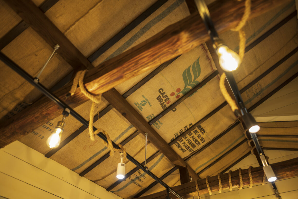 コーヒー屋さんが実際につかっていた麻袋を天井に採用できちゃうんです。