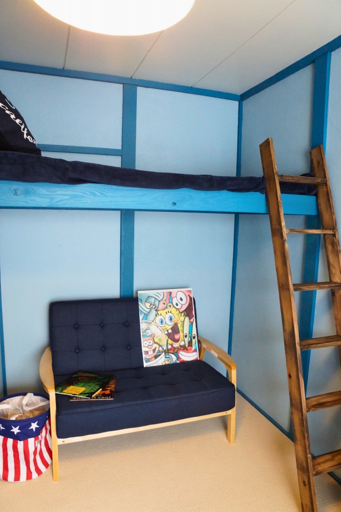 リノベ後のお部屋は、壁・柱をブルーで統一し、遊び心のあるカリフォルニアスタイルに仕上げました。