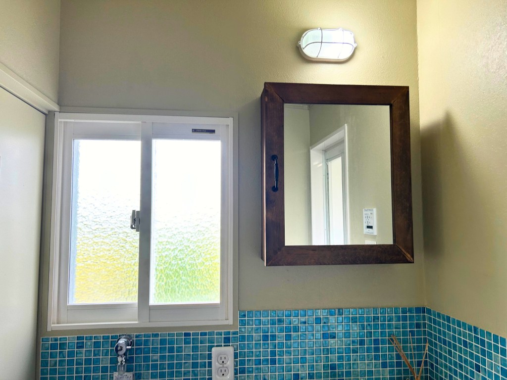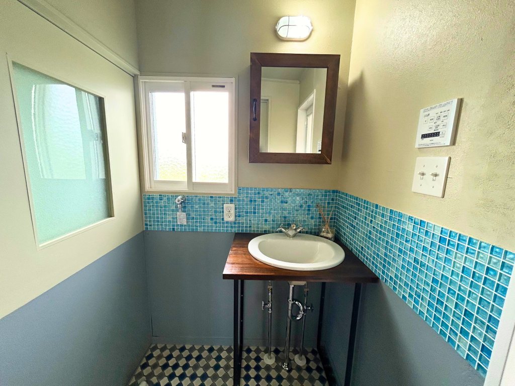 壁は、ベージュ色とグレー色で塗り替え、腰壁に水色タイルを設置することによってより、清潔感が溢れる洗面室になっています。それに加え、床材を菱形タイルのクッションフロアを使用し、汚れが目立ちにくいのでとても使いやすいアメリカンヴィンテージな洗面室になりました!
