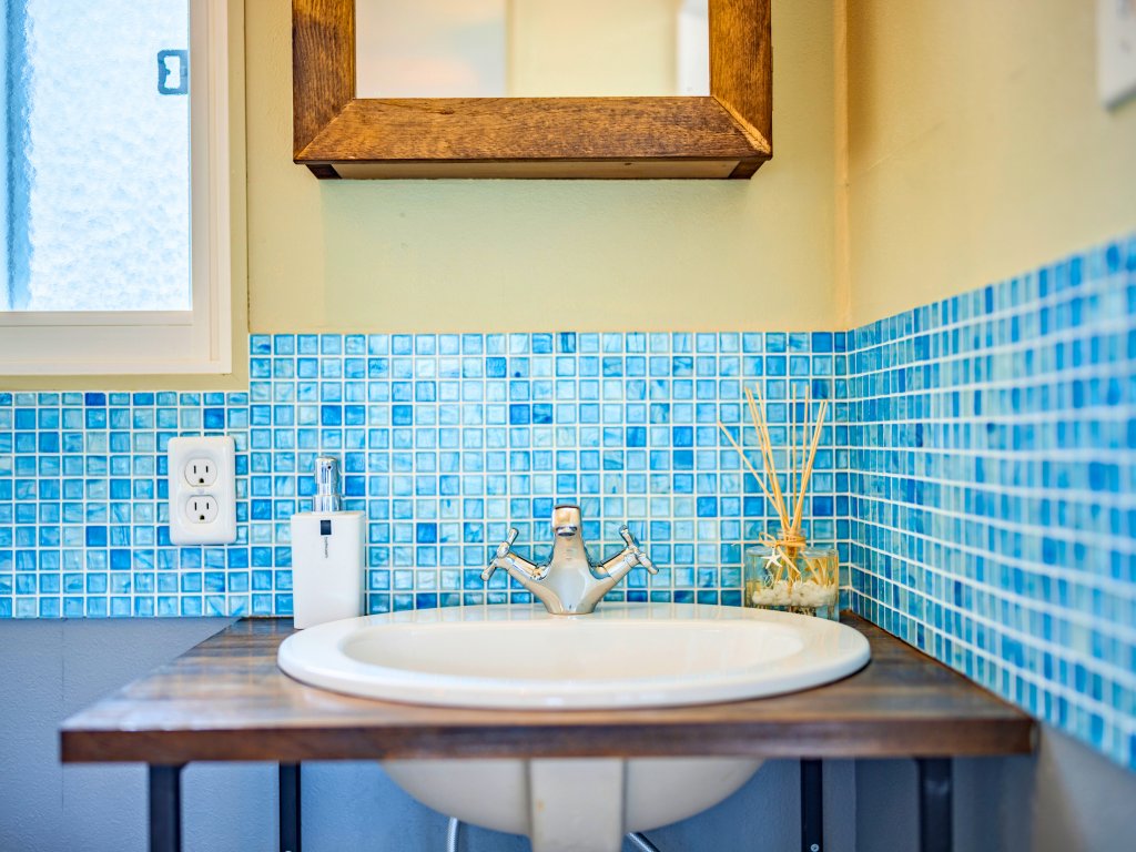 洗面化粧台は、従来ある古い物から外国で使用する洗面ボウル埋め込み型の洗面に交換。高級ホテルで見たことあるような作りで洗面水栓も洋風な佇まいで以前とうって変わってオシャレな雰囲気に♪