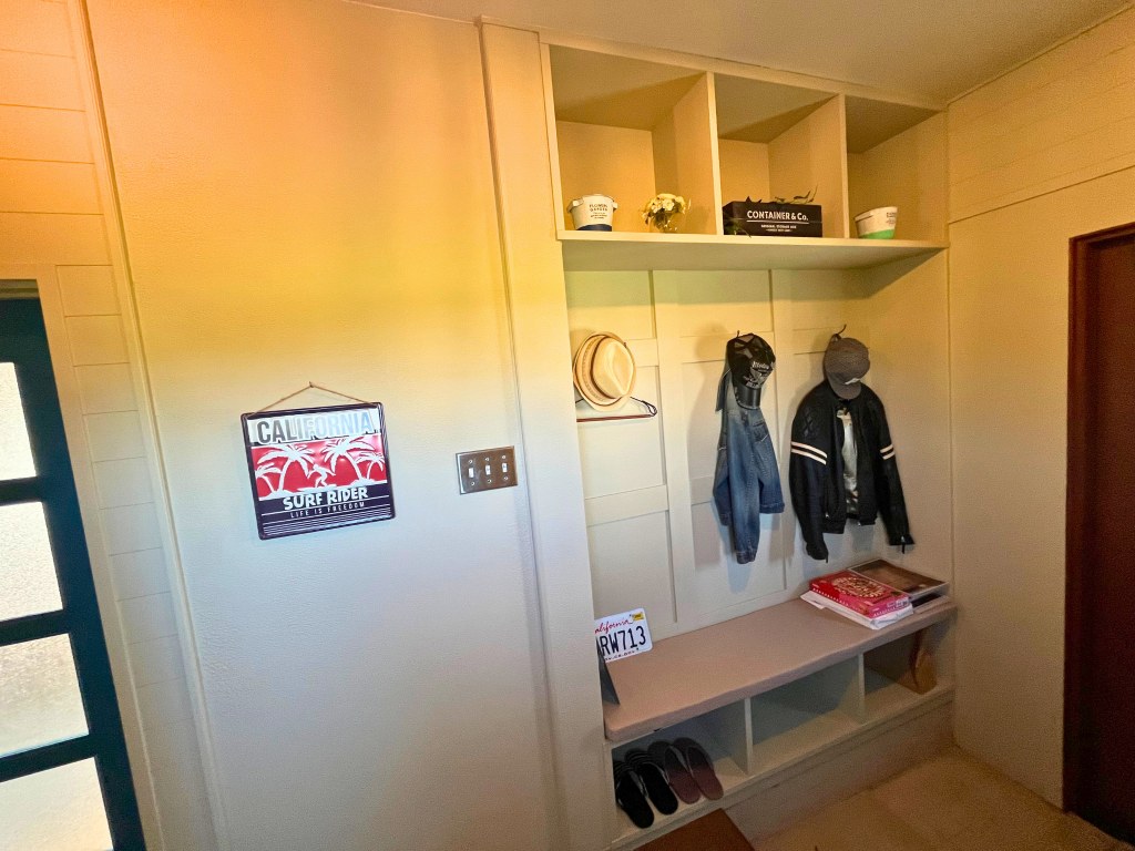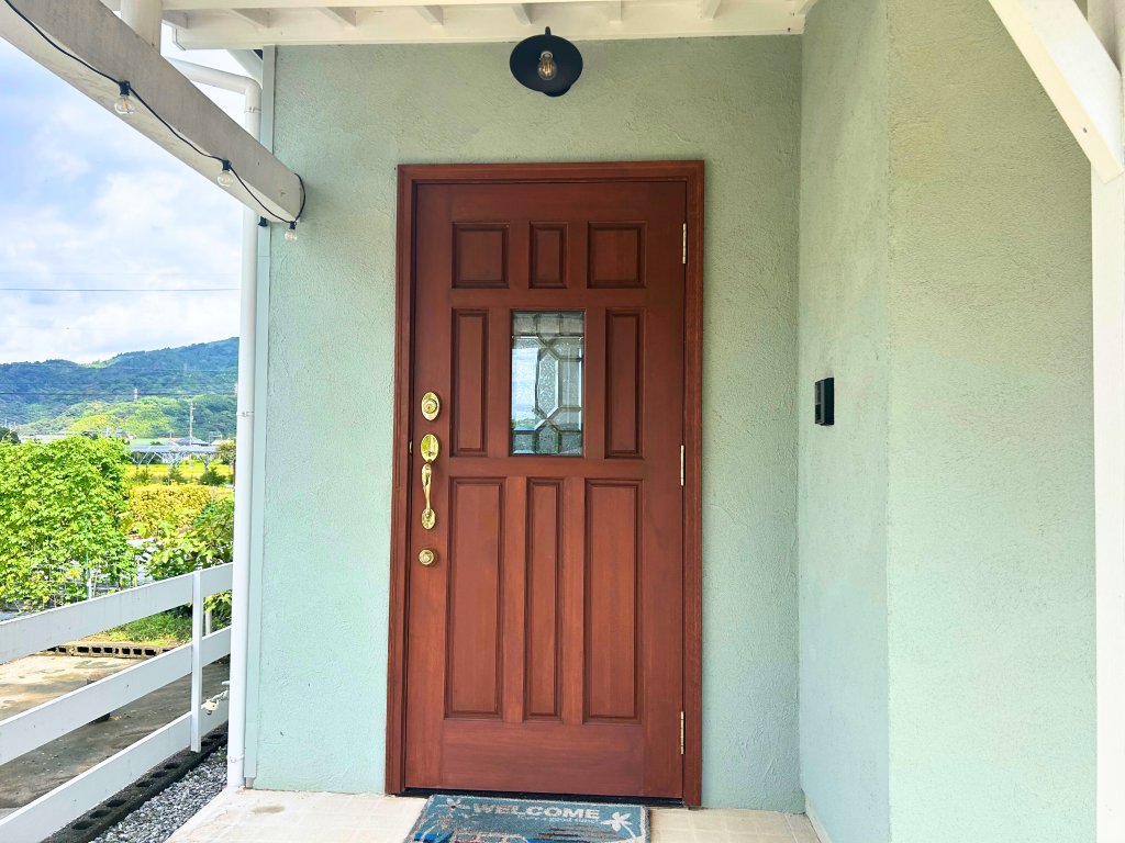 まずは、エントランスルームから。エントランスは、お家のお顔。Beforeの玄関は、壁や天井が木目調でやや暗く、古めで閉鎖的な印象がありましたがリノベーション後は、玄関戸を開けてアメリカンヴィンテージらしさをパッと感じるかと思います。