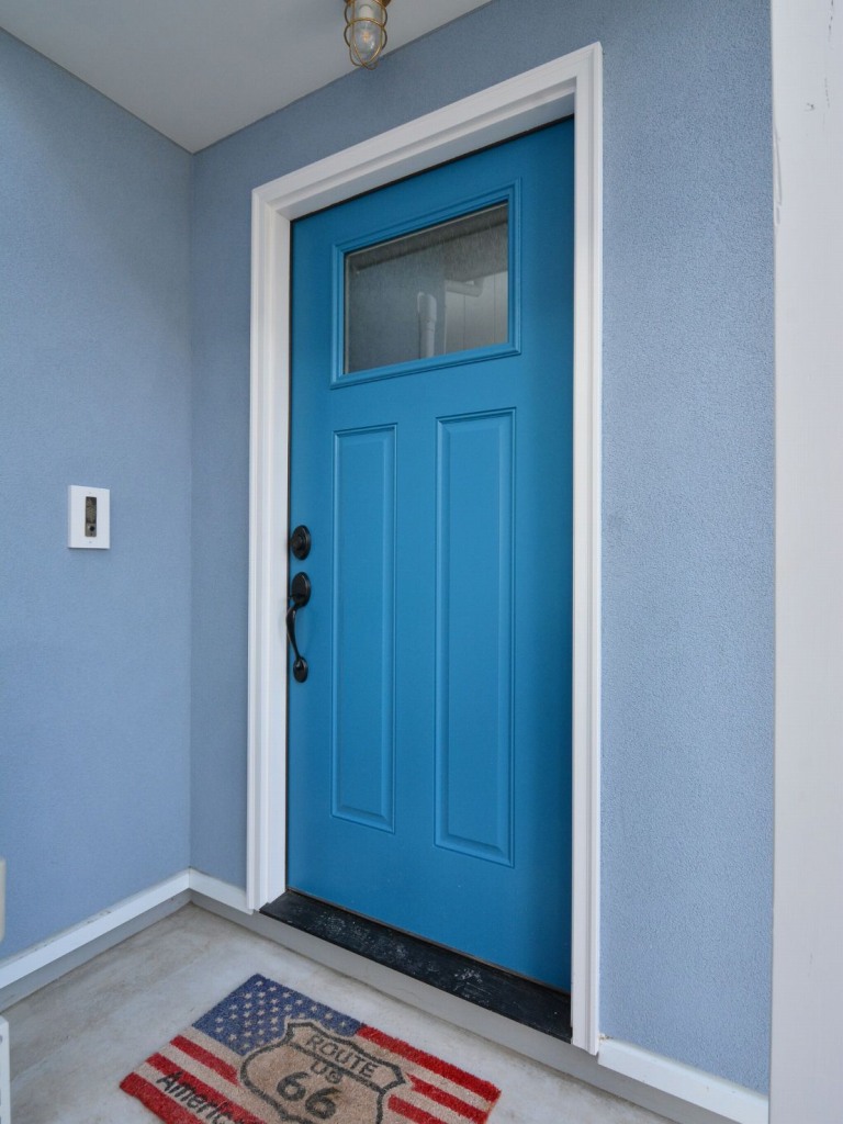床まわりもすっきりとした仕上がりに整え、帰宅時に「気持ちが切り替わる」玄関空間を意識しています。ブルーのドアがアクセントとなり、シンプルながらも印象に残るファサードデザインとなりました。