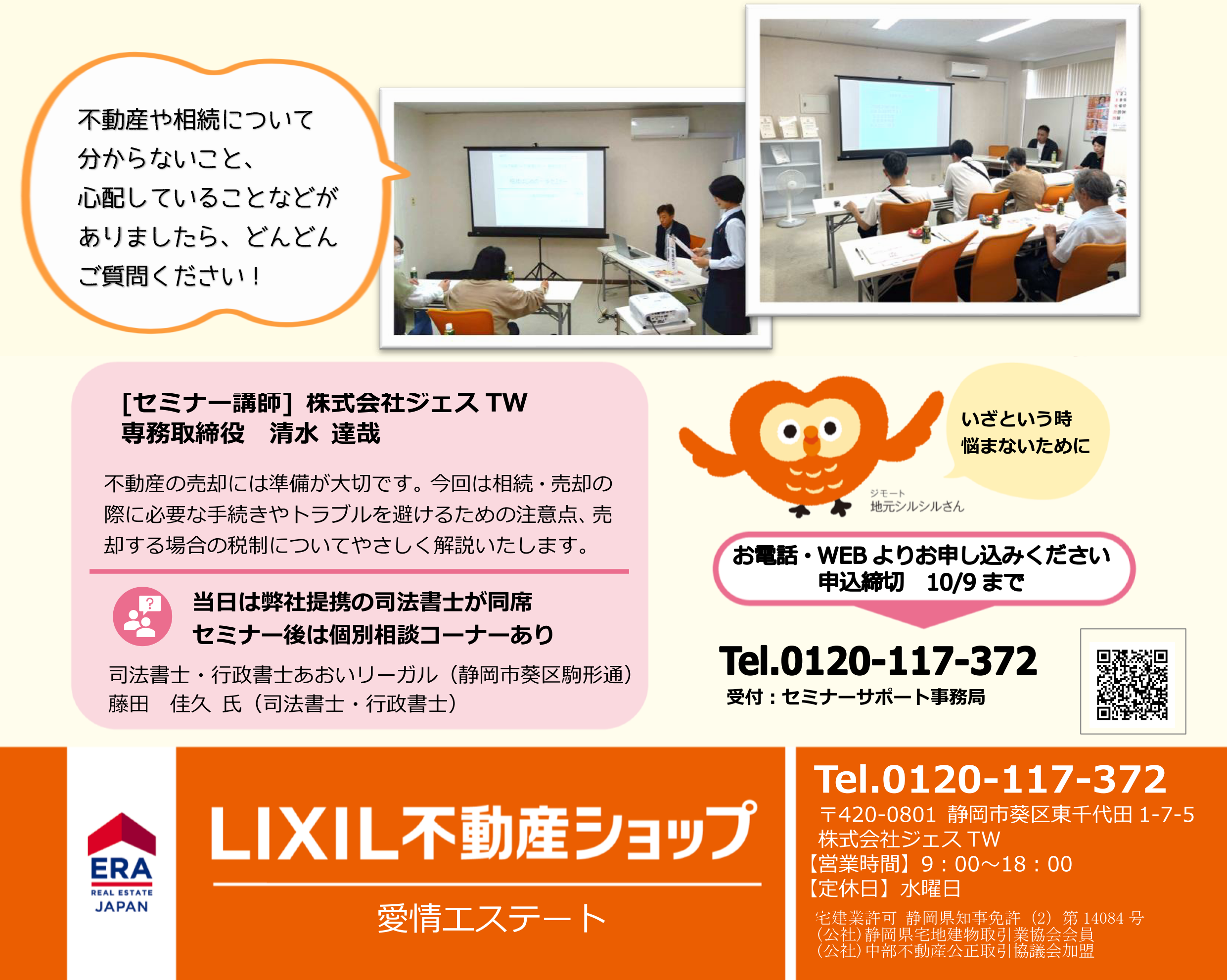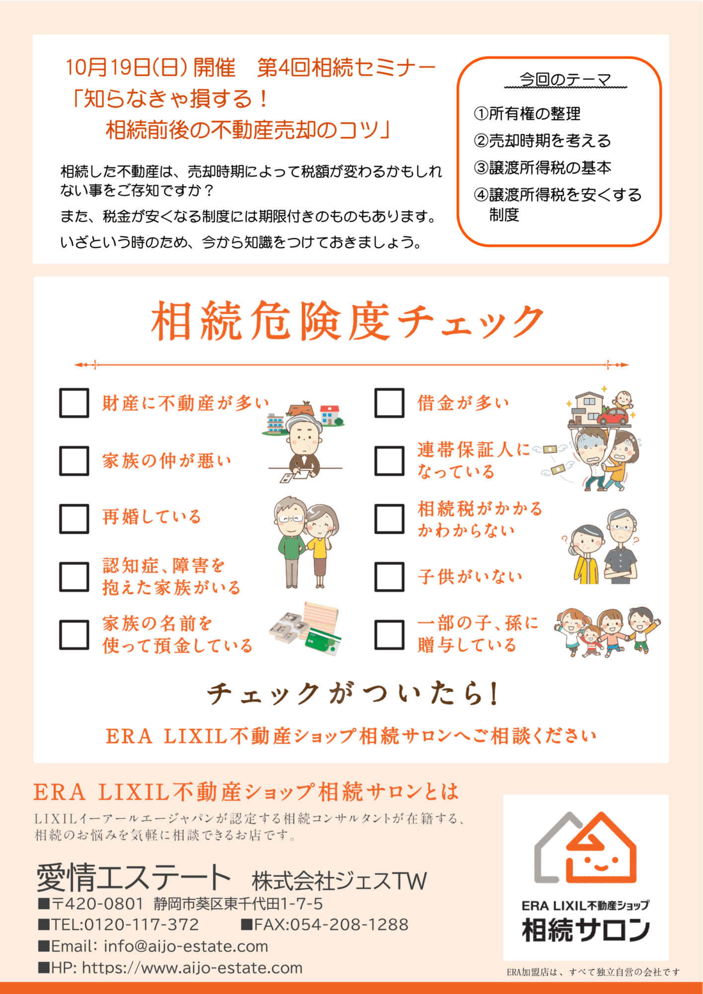 10/19(日)葵区東千代田の愛情エステートにて【第4回相続セミナー】を開催致します。