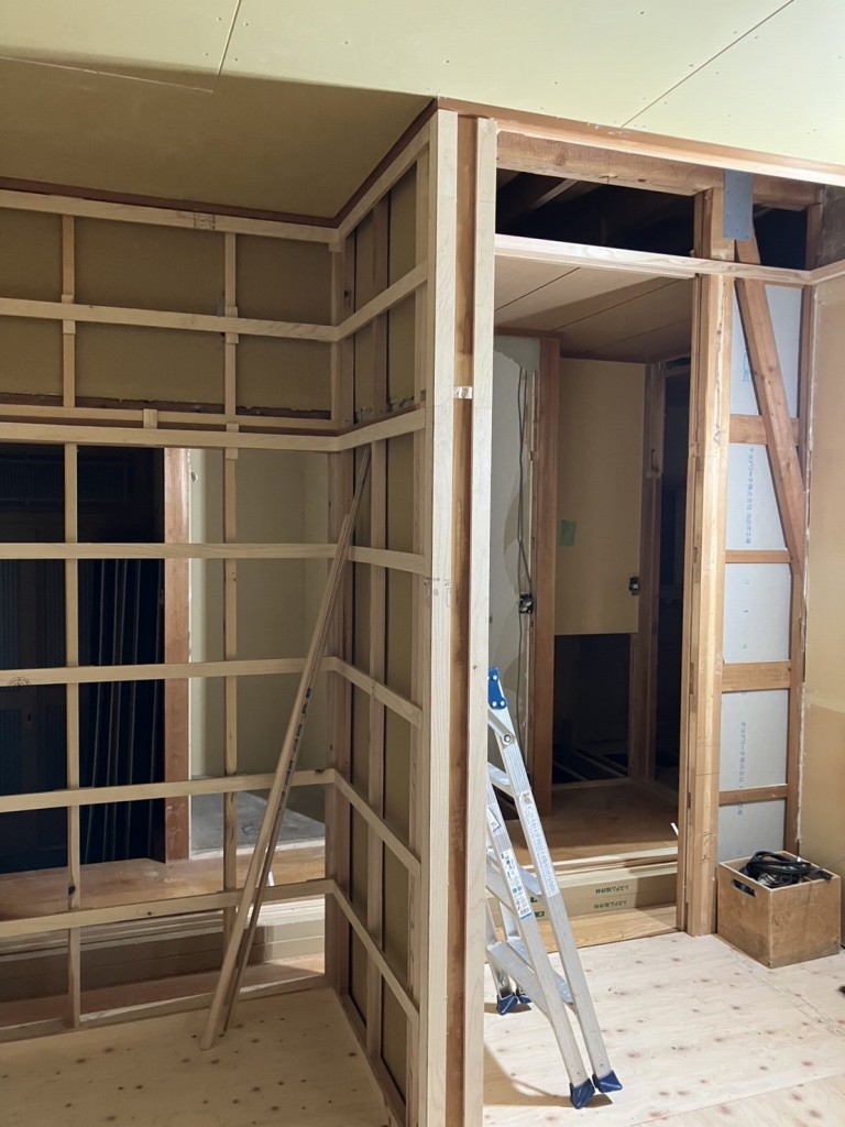 今回の現場では、既存の構造を活かしながら、新たな間取りに合わせて壁や天井の下地を一から丁寧に組み直しました。